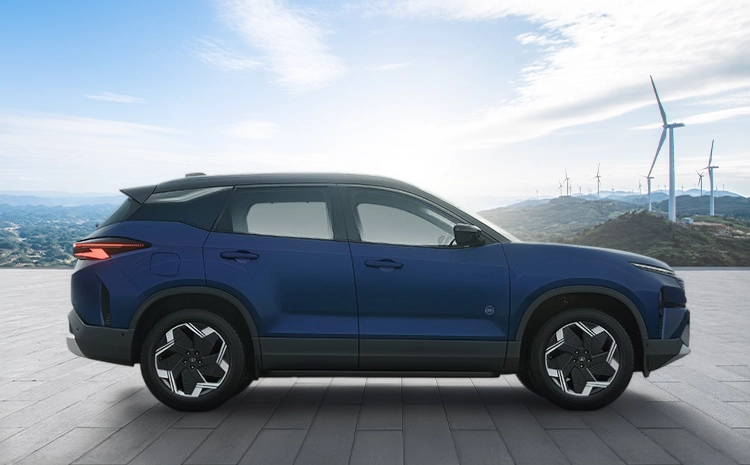 The Tata Harrier EV features 18-inch alloy wheels on the Adventure variants, while the higher Fearless+, Empowered, and QWD variants are equipped with 19-inch alloy wheels. The SUV has an Independent MacPherson strut with stabiliser bar for the front suspension and an Independent Multi-link suspension with stabiliser bar at the rear..