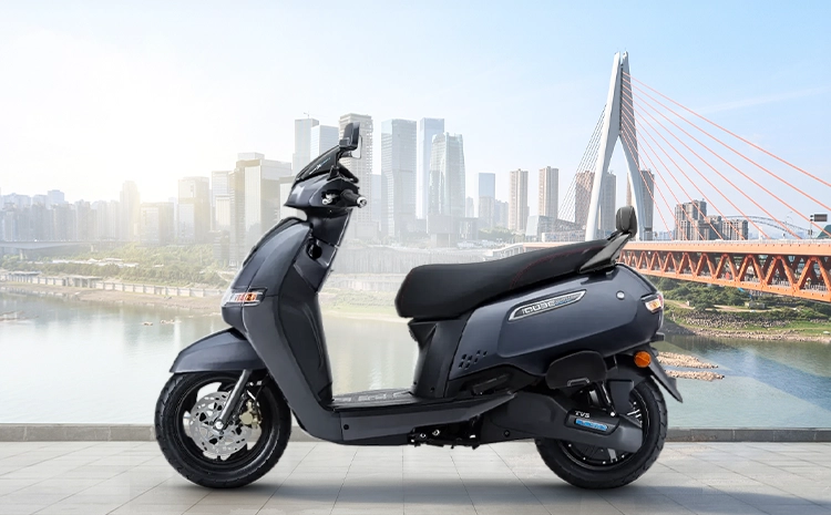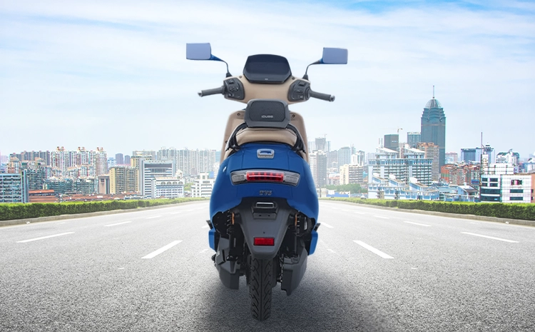 The TVS iQube S comes with 12-inch alloy wheels fitted with 90/90-12 tubeless tyres at both front and rear. The front features telescopic suspension and a disc brake, while the rear is equipped with an adjustable hydraulic twin-tube shock absorber and a drum brake.